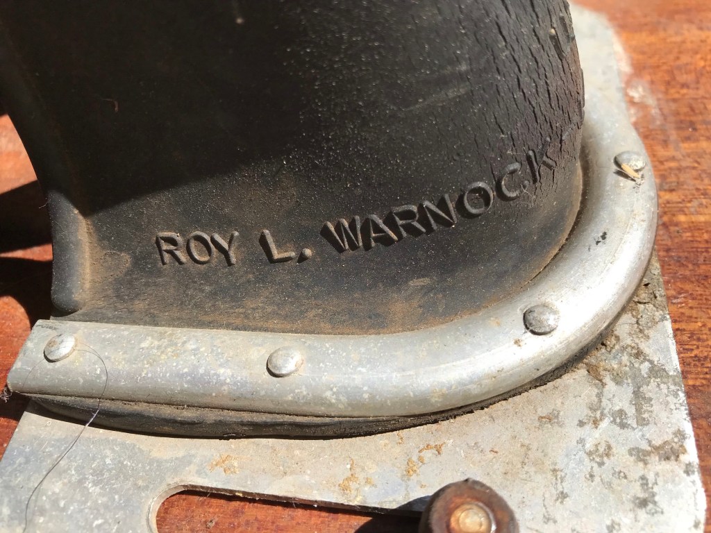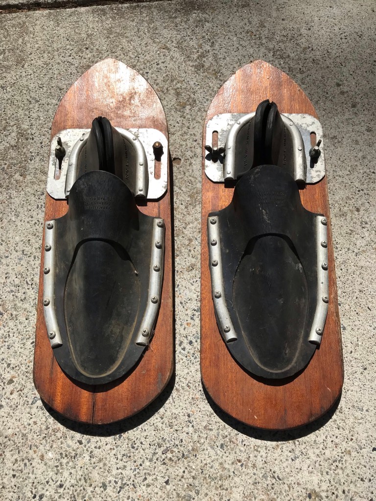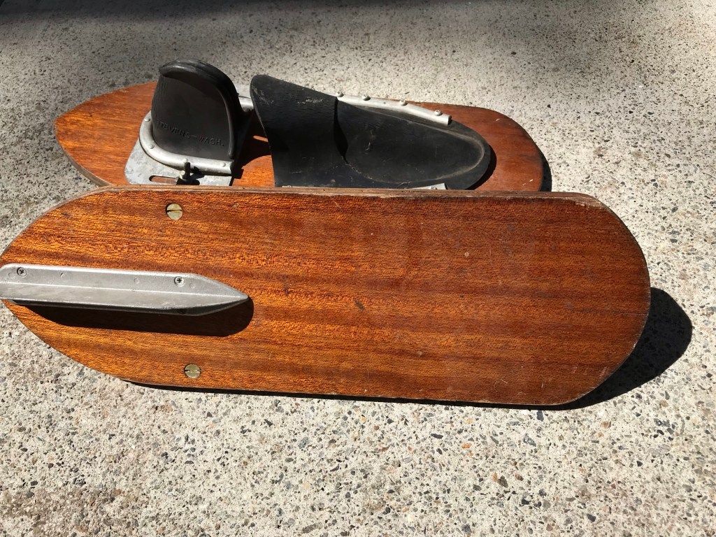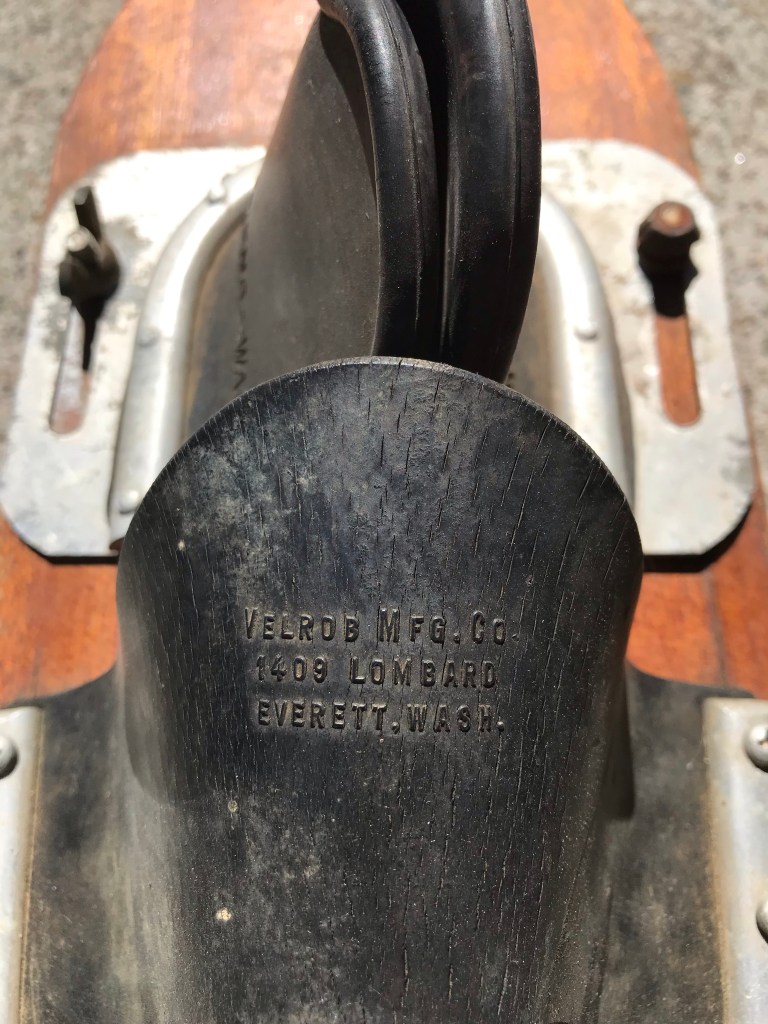In the 1950s waterskiing became very popular. Post war several boat manufacturers popped up and plenty of outboard motor companies started producing 30-50hp motors. In Washington state the Velrob manufacturing company was producing water skis. These skis were popular as far away as Colorado. My mother used her first paycheck at the telephone company where she worked to buy her Velrob slalom ski at Dave Cook’s Sporting Goods in downtown Denver. I’ve been collecting these skis to display and restore for use. I recently saw these shoe skis for sale on Craigslist and snatched them up because I could tell they are original. They may be later than the 1950s because of the black bindings. I’ve heard othe manufacturers started using the black bindings because then rubber would last longer. This is the first set I’ve ever seen that have the Velrob name on the toe. All the others I have say Tournament on the toe and only mention Roy Warnock on the heel.