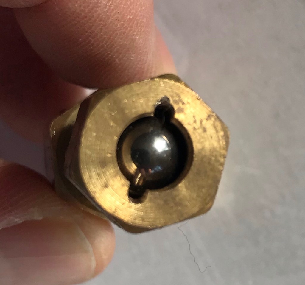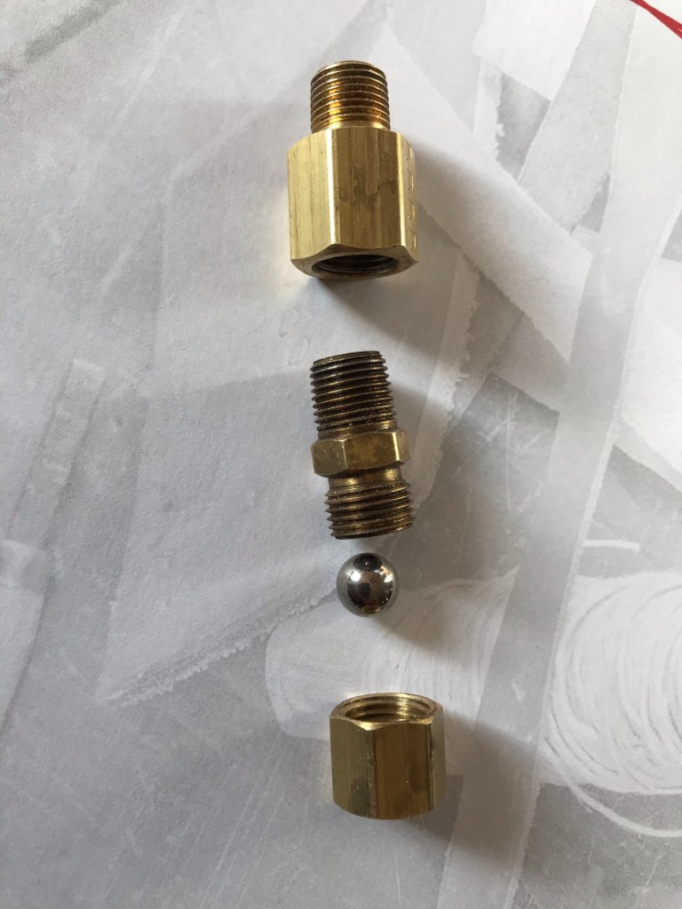 After a quick trip to my favorite brass fitting store. Really, I have a store. Great guy and willing to sort things out with you. I had the parts I needed. I happened to have a ball bearing sitting around too.