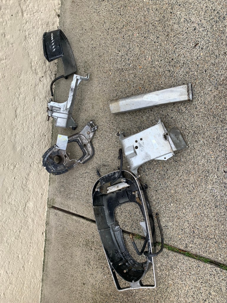 The bottom cowl, trim cover and exhaust parts were of course very greasy. I was powerwashing something else today and decided to clean these a bit. Mostly I wanted to see how bad they are and if I need to media blast them. I’m going to use this motor so it will get scratched so I’ll probably just lightly sand and then use an epoxy primer.