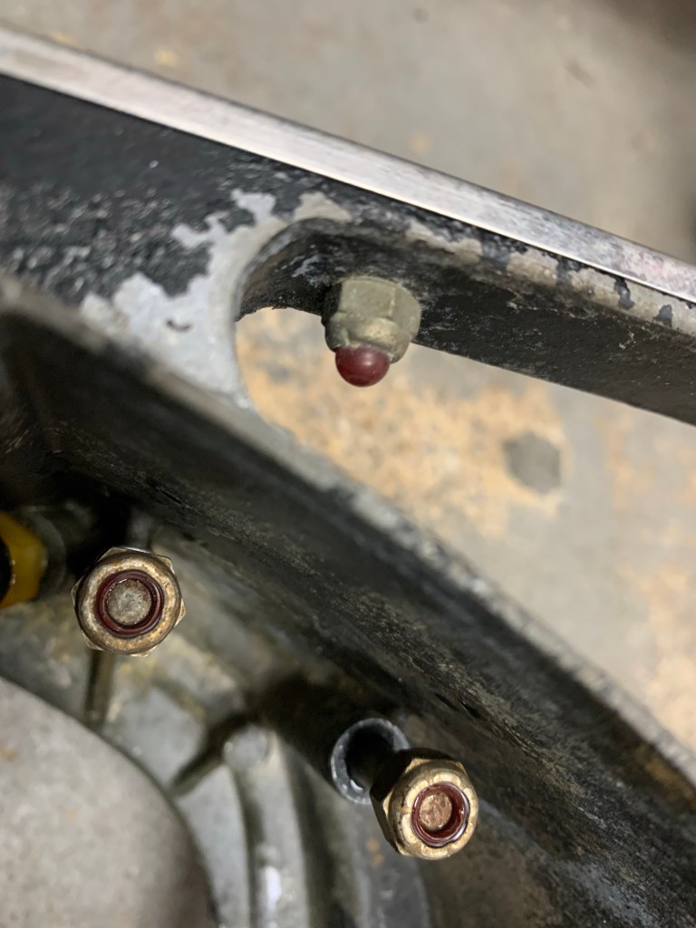 I am curious about the red cap on these nuts. They seem to be fancy acorn nuts. I’ve seen them on my 1959, 60, 61 and 65 motors. A quick Google search made me think that their purpose is to protect your hands from sharp points when lifting the motor in addition to protecting threads from water. I’ll see if the red caps come off when I remove the nuts.