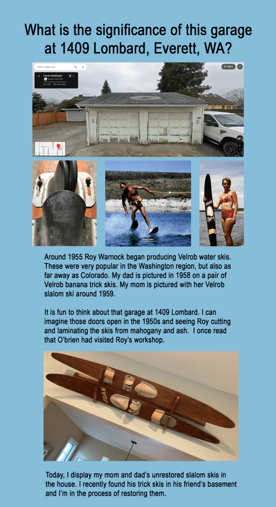 When I have free time, one of my favorite things to think about are Velrob water skis and how they were manufactured. I recently was looking at the binding of a pair of Velrob skis and noticed the address of 1409 Lombard in Everett, WA. I hope you like the pictures on this post.