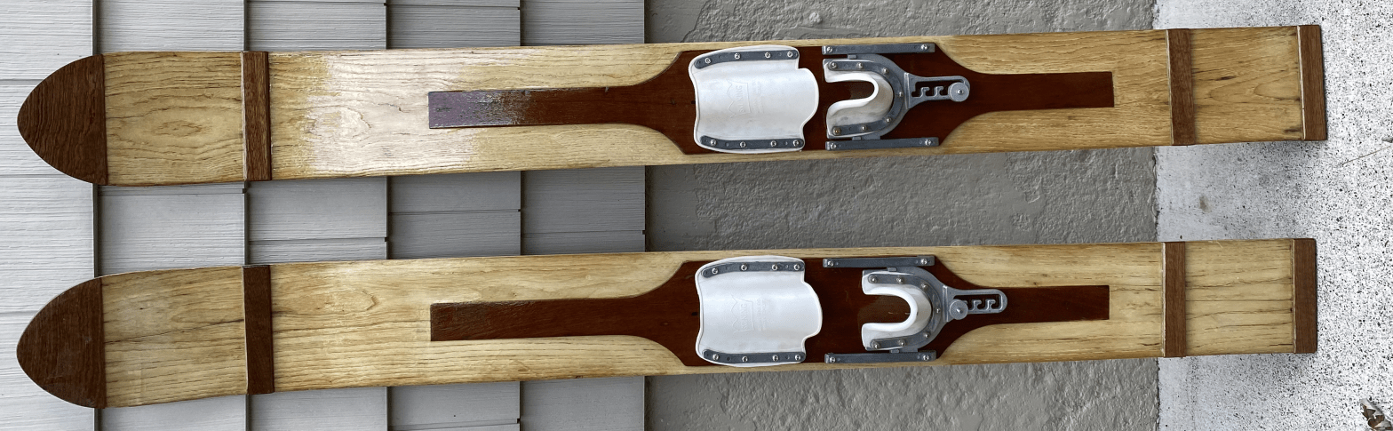 I picked these up from a friend. My father skied on them in the late 1950s and I’m going to relaminate them, restore them and then ski on them. At first I thought I’d put on modern bindings but I am now looking to restore the bindings too.